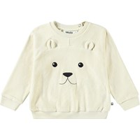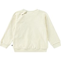 Off-weißes Sweatshirt für die Kleinen aus Öko-Baumwolle mit einer ungekämmten Innenseite, die an heißen Tagen angenehm kühl ist. Das Sweatshirt hat gerippte Bündchen an Taille und Ärmeln sowie einen Rundhalsausschnitt mit zwei Druckknöpfen hinten, um das An- und Ausziehen zu erleichtern. Auf der Vorderseite des Sweatshirts befindet sich ein niedliches Teddybären-Gesicht mit kleinen Ohren.