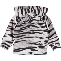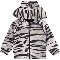 Dirki ist ein Baby-Sweatshirt aus Öko-Baumwolle mit schwarz-weißem Tiger-Print. Das Sweatshirt hat vorne einen Reißverschluss, Rippbündchen an Ärmelöffnung und Hüfte sowie eine Kapuze mit kleinen süßen Tigerohren. Auf der Brust befindet sich ein aufgedrucktes gelbes Panthera-Logo.