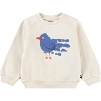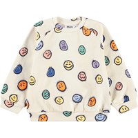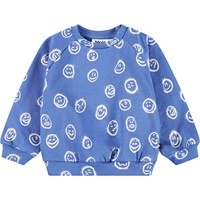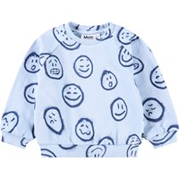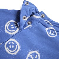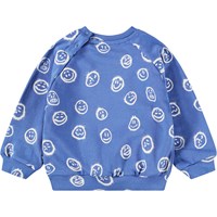 Blauer Pullover für die Kleinen aus weicher Öko-Baumwolle mit einem Druck von Gesichtern in verschiedenen Stimmungen. Der Pullover hat Raglanärmel, gerippte Abschlüsse an Taille und Ärmeln sowie einen Rundhalsausschnitt mit zwei Druckknöpfen am Hals, um das An- und Ausziehen zu erleichtern. Kombinieren Sie ihn mit der passenden Hose für ein komplettes Set.