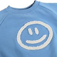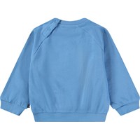 Blauer, weicher Pullover für die Kleinen aus Bio-Baumwolle mit aufgenähtem Kunstwerk. Der Pullover hat Raglanärmel, gerippte Kanten und einen runden Halsausschnitt mit Druckknöpfen auf der Rückseite, um das An- und Ausziehen zu erleichtern.