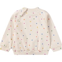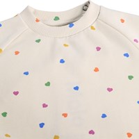 Weißes, weiches Sweatshirt für die Kleinen aus Bio-Baumwolle mit Herzaufdruck. Das Sweatshirt hat Raglanärmel, gerippte Kanten und einen runden Halsausschnitt mit Druckknöpfen am Rücken, um das An- und Ausziehen zu erleichtern.