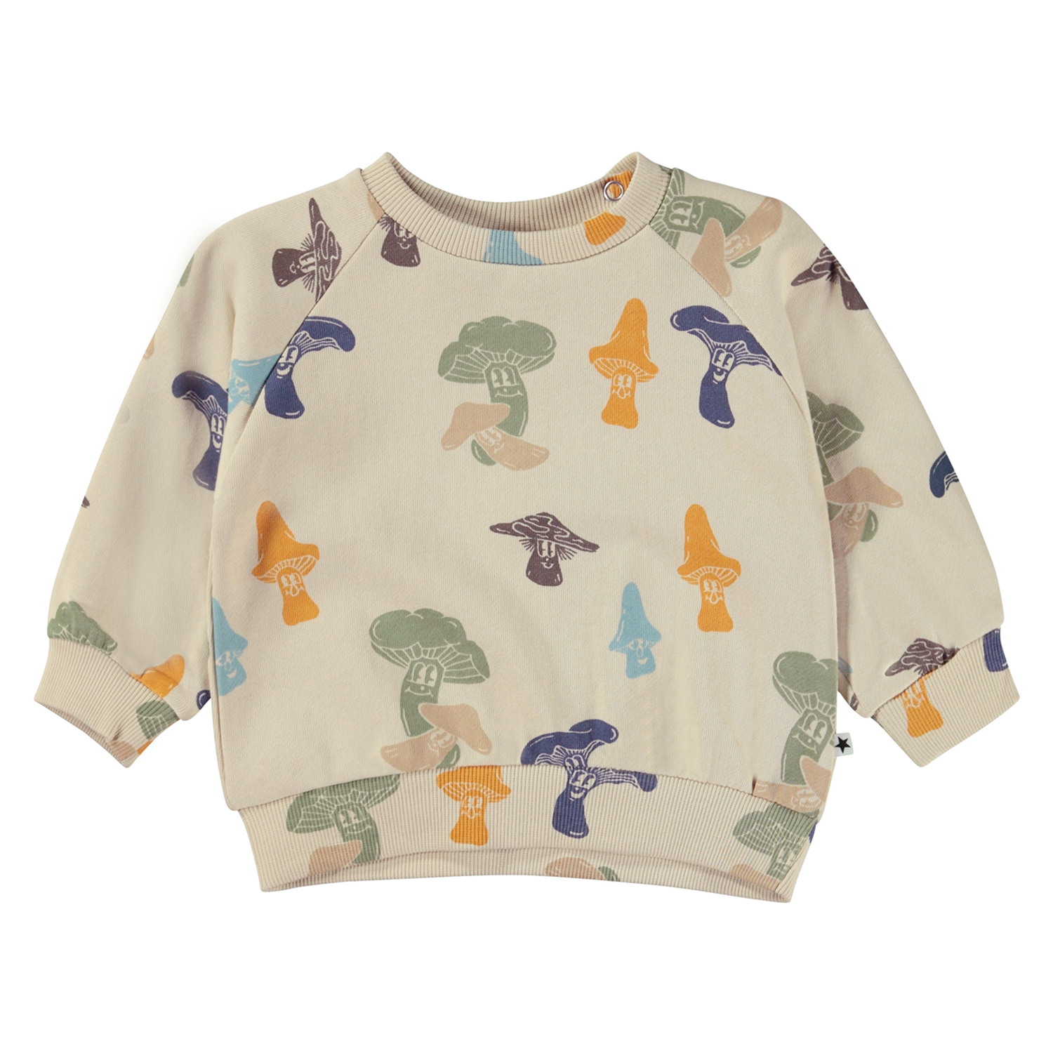 Offwhite-Langarmsshirt im Allover-Print für die Kleinen. Der Druck besteht aus niedlichen kleinen handgezeichneten Cartoon-Pilzen in verschiedenen Farben. Dieses Shirt besteht aus 100% Baumwolle, hat einen Rundhalsausschnitt mit Rippbündchen, Raglanärmel, Rippbündchen an Ärmeln und Hüfte sowie Druckknöpfe am Halsausschnitt, sodass das Shirt leicht an- und auszuziehen ist. Kombinieren Sie evt. dieses Shirt mit der Hose Simeon im gleichen Aufdruck für das perfekte Set.