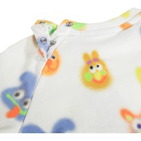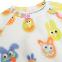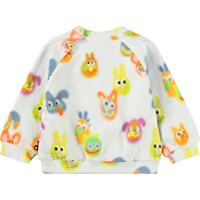 Weißes, weiches Sweatshirt für die Kleinen aus Bio-Baumwolle mit einem lustigen Druck. Das Sweatshirt hat Raglanärmel, gerippte Kanten und einen runden Halsausschnitt mit Druckknöpfen am Rücken, um das An- und Ausziehen zu erleichtern.