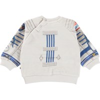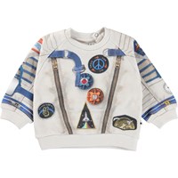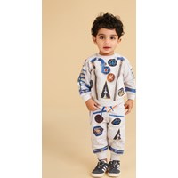 Disc ist ein weißes Baby-Sweatshirt mit Astronauten-Raumanzug-Aufdruck. Das Sweatshirt wird im Nacken geknöpft. Kombinieren Sie die Bluse mit der passenden Babyhose.