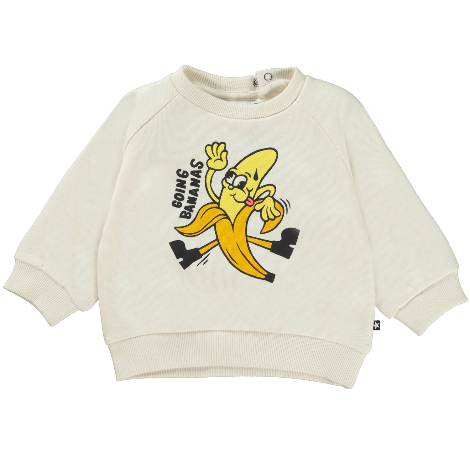 Disc ist ein cremefarbenes Baby-Sweatshirt mit dem Aufdruck einer lustigen Banane. Das Sweatshirt wird im Nacken geknöpft. Kombinieren Sie das Sweatshirt mit der passenden Babyhose.