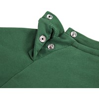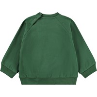 Dunkelgrüner Pullover für die Kleinen aus weicher Öko-Baumwolle mit einem gestickten lächelnden Gesicht auf der Vorderseite. Der Pullover hat Raglanärmel, gerippte Abschlüsse an Taille und Ärmeln sowie einen runden Ausschnitt mit zwei Druckknöpfen hinten, um das An- und Ausziehen zu erleichtern. Kombinieren Sie ihn mit der passenden Hose für ein komplettes Set.
