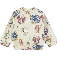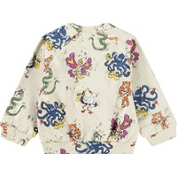 Cremefarbener, weicher Pullover für die Kleinen aus Bio-Baumwolle mit Musikdruck. Der Pullover hat Raglanärmel, gerippte Kanten und einen runden Halsausschnitt mit Druckknöpfen auf der Rückseite, um das An- und Ausziehen zu erleichtern.