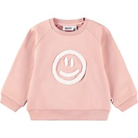 Rosa Sweatshirt für die Kleinen aus weicher Öko-Baumwolle mit einem gestickten lächelnden Gesicht auf der Vorderseite. Das Sweatshirt hat Raglanärmel, gerippte Abschlüsse an Taille und Ärmeln sowie einen runden Ausschnitt mit zwei Druckknöpfen hinten, um das An- und Ausziehen zu erleichtern. Kombinieren Sie es mit der passenden Hose für ein komplettes Set.