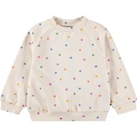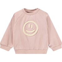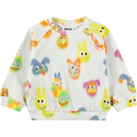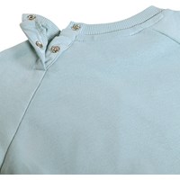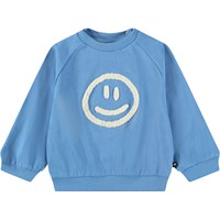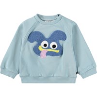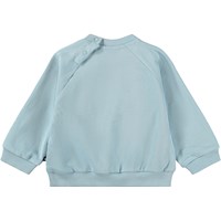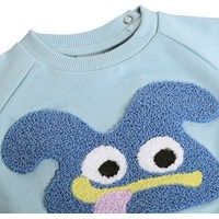Blauer, weicher Pullover für die Kleinen aus Bio-Baumwolle mit aufgenähtem Kunstwerk. Der Pullover hat Raglanärmel, gerippte Kanten und einen runden Halsausschnitt mit Druckknöpfen auf der Rückseite, um das An- und Ausziehen zu erleichtern.