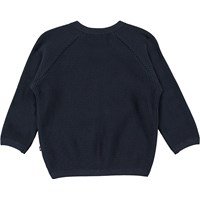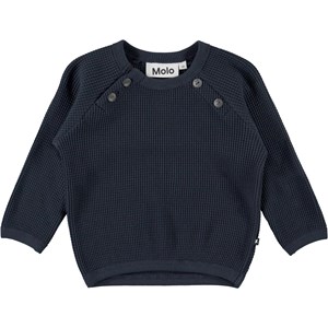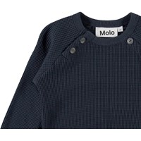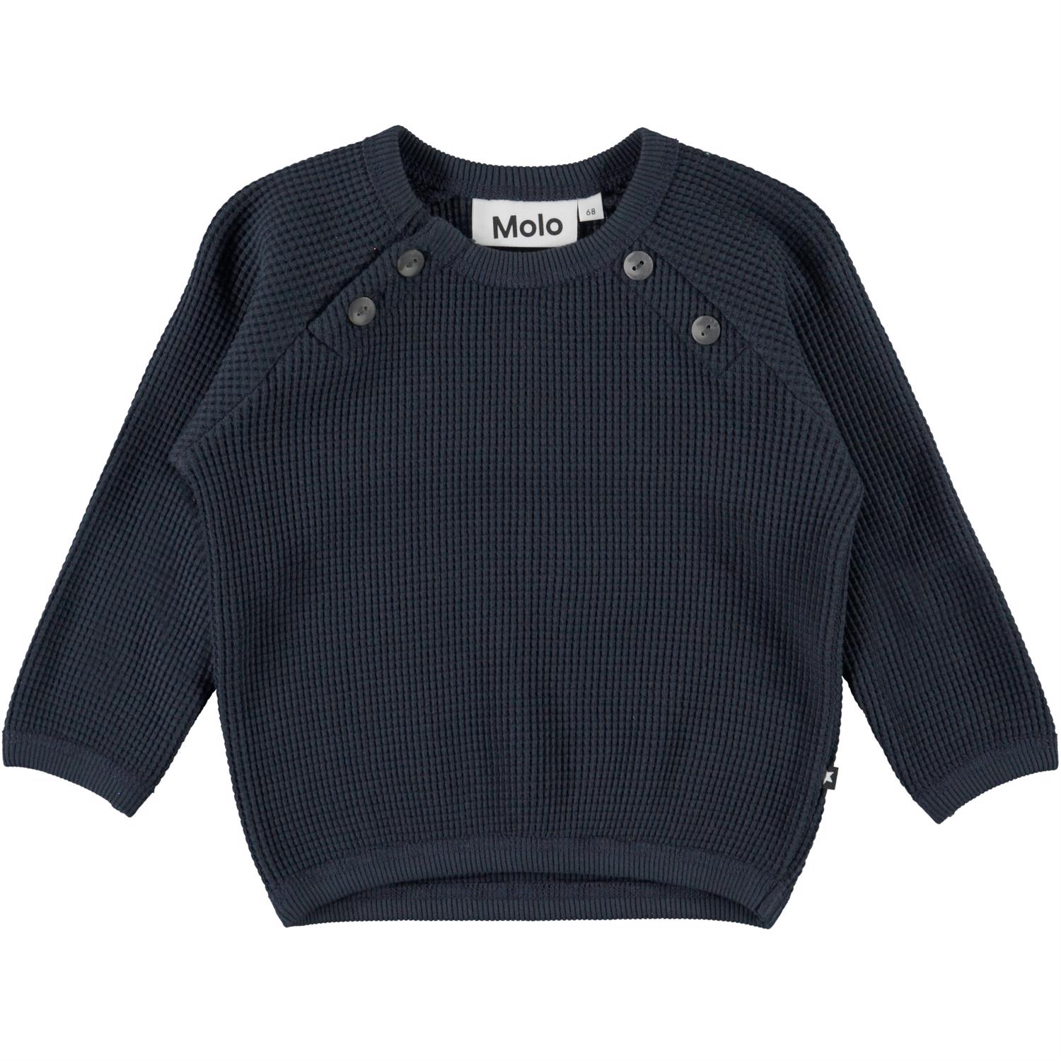Dolly ist ein dunkelblaues Baby-Sweatshirt aus waffeliger Öko-Baumwolle. Das Sweatshirt hat Knöpfe auf der Vorderseite.