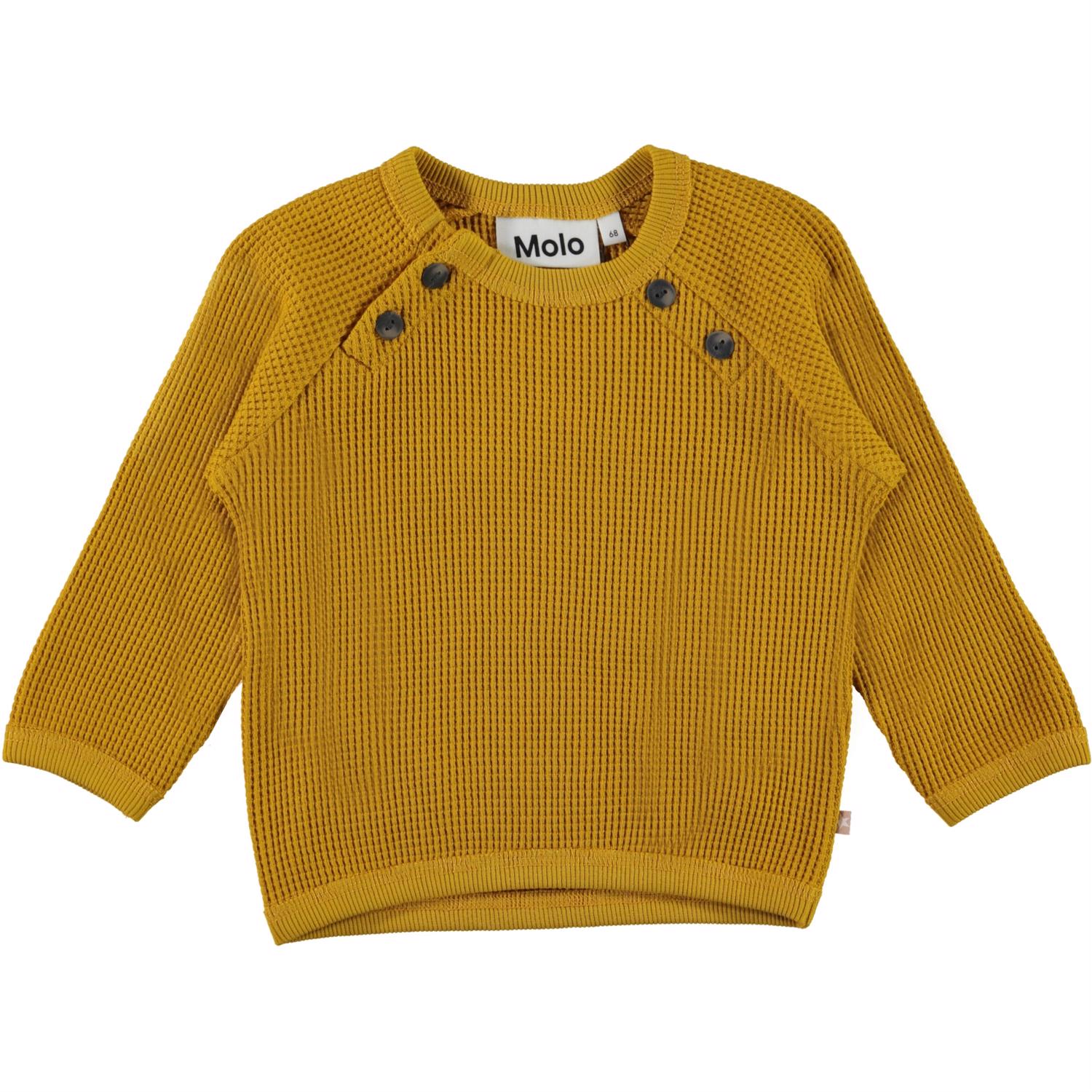 Dolly ist ein goldenes Baby-Sweatshirt aus waffeliger Öko-Baumwolle. Das Sweatshirt hat Knöpfe auf der Vorderseite.