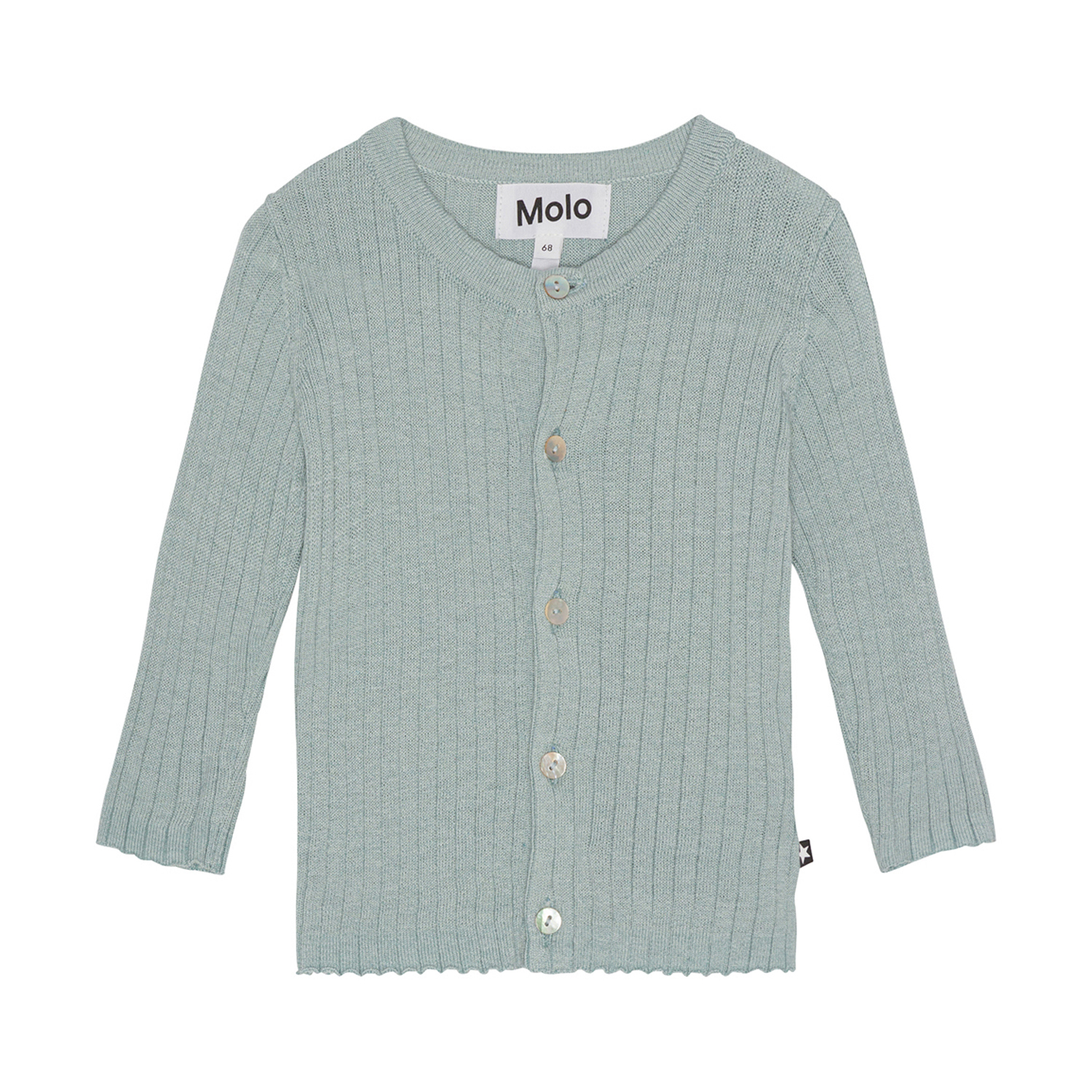 Staubblauer Cardigan für die Kleinen aus einer weichen, gerippten Viskosemischung. Der Cardigan ist figurbetont geschnitten, hat einen Rundhalsausschnitt mit kleiner, feiner Rippkante und einen Knopfverschluss mit kleinen Perlmuttknöpfen. Kombinieren Sie die Strickjacke mit der passenden Hose und erhalten Sie ein weiches und luxuriöses Set.