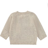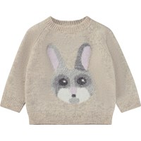 Beigefarbener Strickpullover mit Kaninchenmotiv für die Kleinen. Das niedliche Kaninchen sitzt in der Mitte des Bauches und ist in Grautönen gehalten, mit rosa Ohren und Nase. Dieser Pullover ist aus einer weichen Alpaka-Wollmischung gefertigt, hat einen Rundhalsausschnitt mit Rippbündchen, Raglanärmel und Rippbündchen an Händen und Hüften.