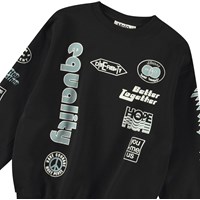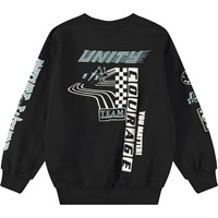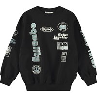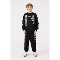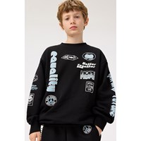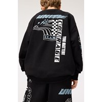 Weiches Sweatshirt aus Öko-Baumwolle mit gerippten Kanten am Hals, an den Ärmeln und am unteren Saum des Sweatshirts. Der Pullover hat eine oversize Passform, lange Ärmel mit einer tiefen Schulternaht und Drucke mit Motocross-Referenzen.