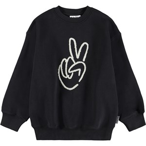 Schwarzer Sweatshirt aus weicher Öko-Baumwolle mit einem großen Aufdruck eines handgezeichneten Friedenszeichens. Der Sweatshirt hat eine übergroße Passform mit gerippten Kanten am Hals, an den Ärmeln und am Saum.