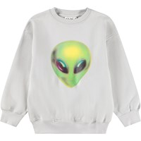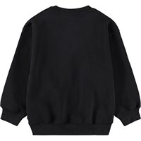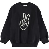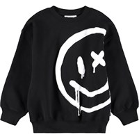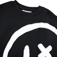 Schwarzer Sweatshirt aus weicher Öko-Baumwolle mit einem großen weißen Aufdruck eines lächelnden Gesichts, das wie mit Sprayfarbe gemalt aussieht. Der Sweatshirt hat eine übergroße Passform mit gerippten Kanten am Hals, den Ärmeln und am Saum.