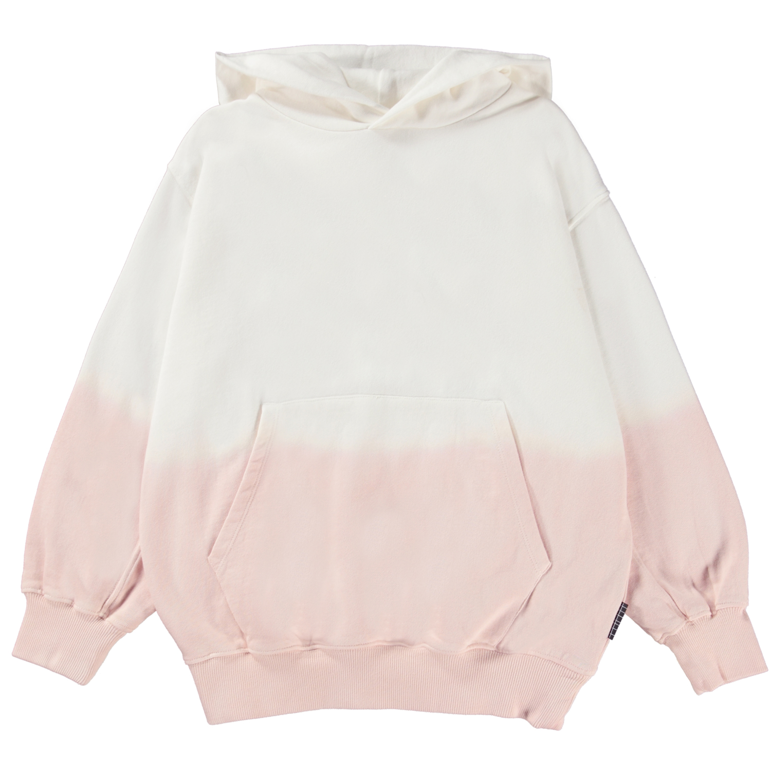 Maxx ist ein Unisex-Hoodie, das oben weiß und unten rosa ist. Der Hoodie hat eine Kängurutasche auf der Vorderseite und Rippkante an der Unterseite und an den Ärmelenden.