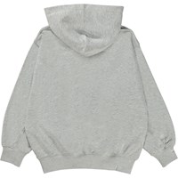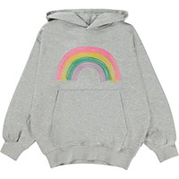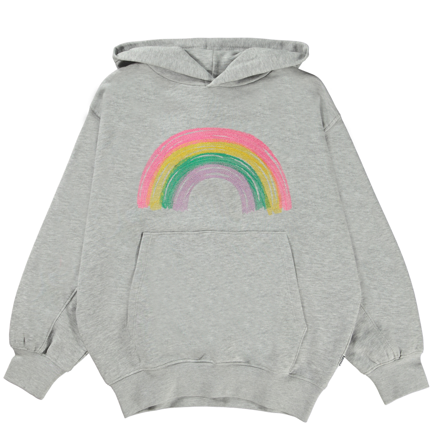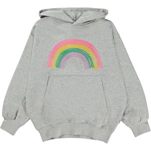 Maxx ist ein graumelierter Unisex-Hoodie mit einem Regenbogendruck auf der Brust. Der Hoodie hat eine Kängurutasche auf der Vorderseite und Rippkante an der Unterseite und an den Ärmelenden. Dieses