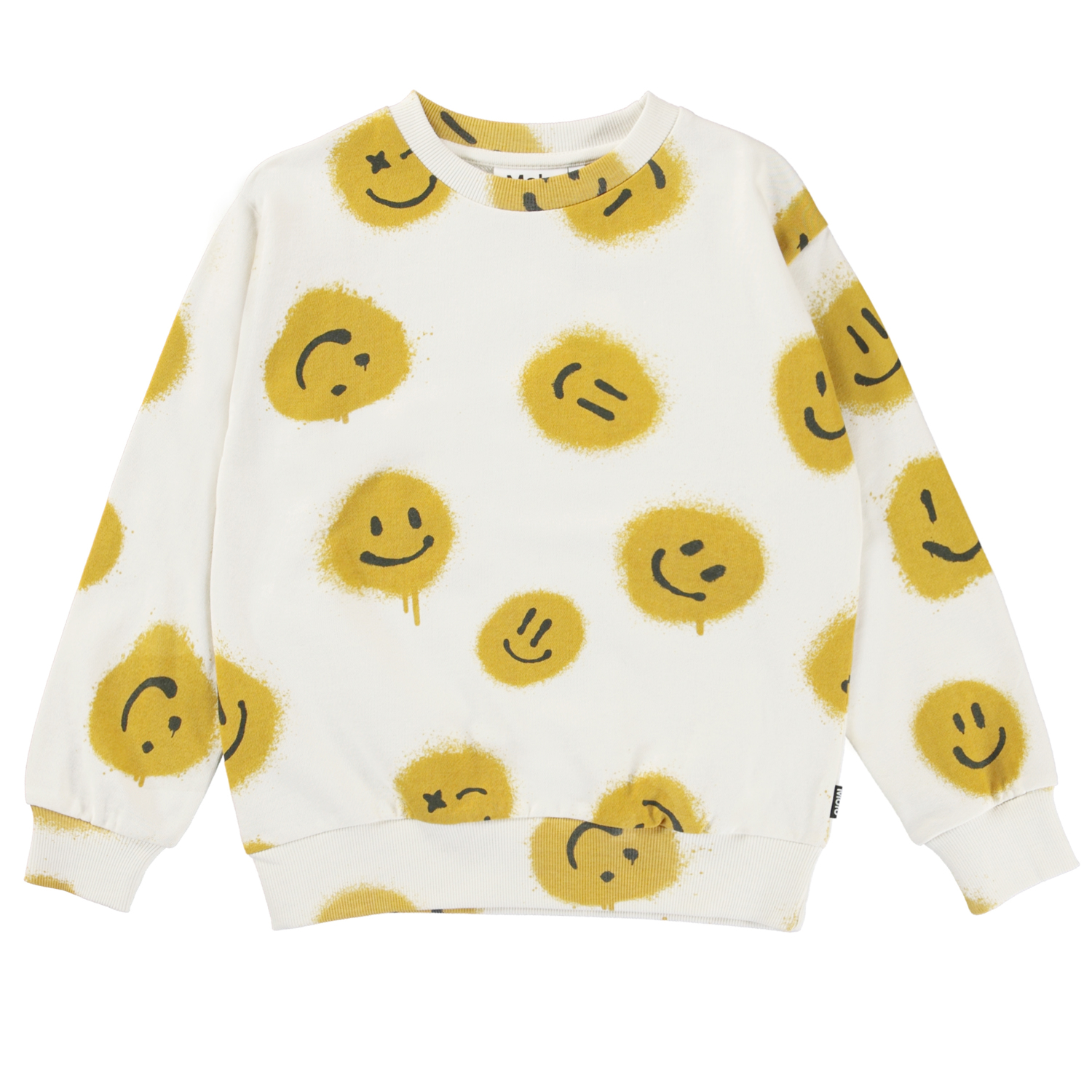 Mik ist ein weißes Sweatshirt mit einem Allover-Print aus gelben, aufgesprühten Smileys. Mik hat Ripp am Hals, Handgelenk und Hüfte.