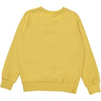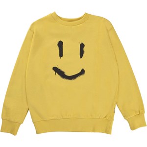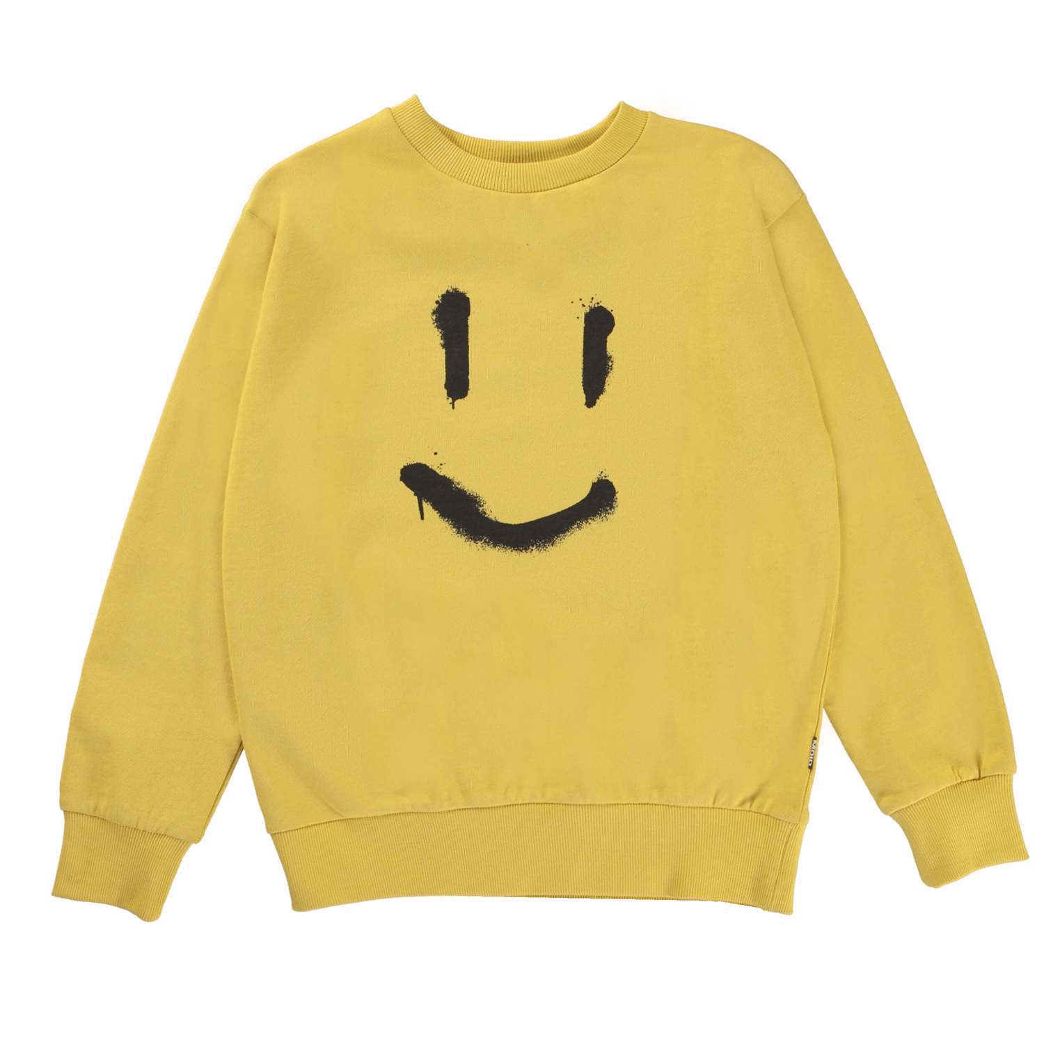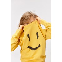 Mik ist ein sonniges gelbes Sweatshirt mit einem schwarzen Smiley-Tag mitten auf dem Bauch.