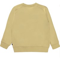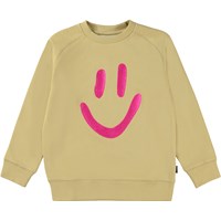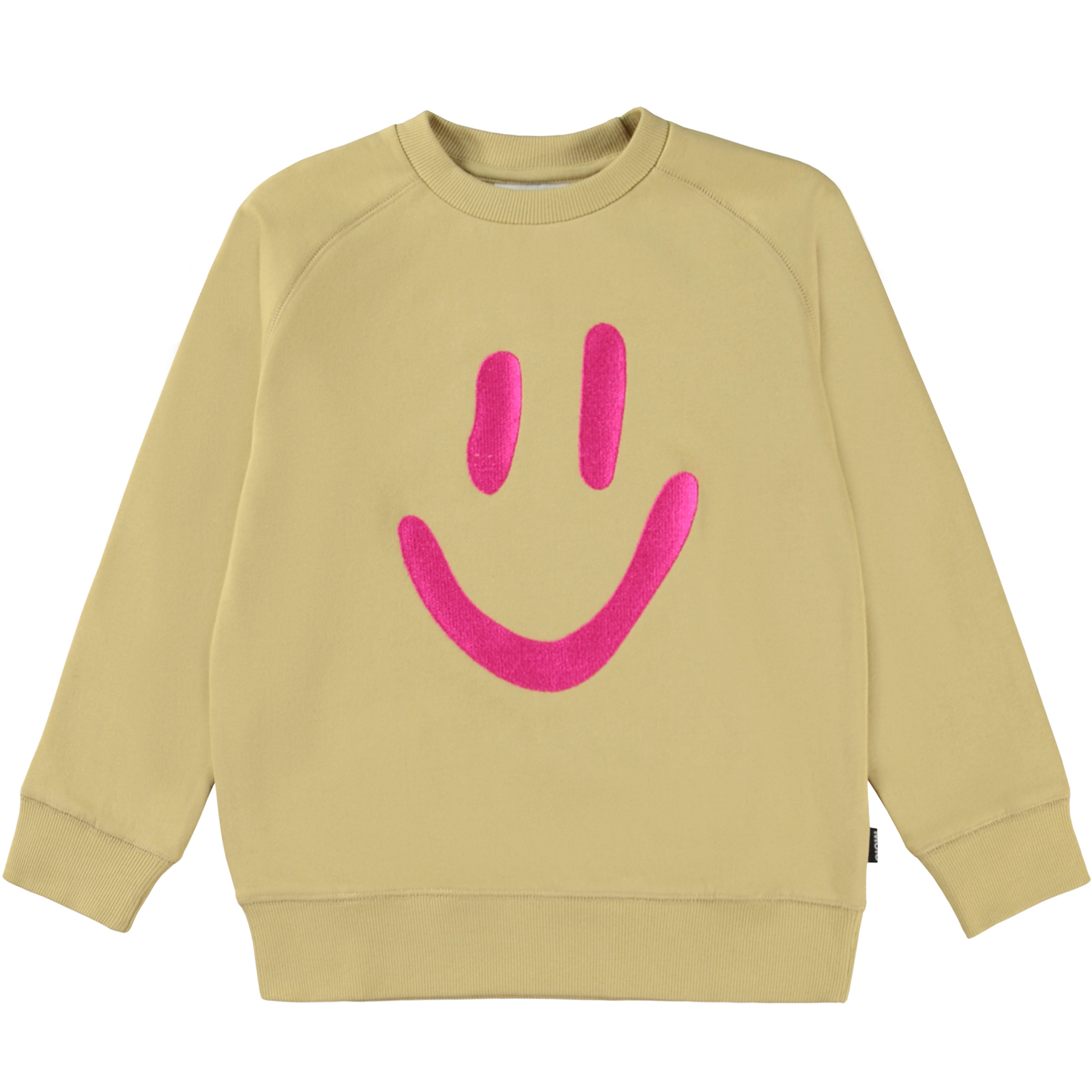 Mike ist ein beige/grünes Unisex-Sweatshirt mit einem Aufdruck eines rosa Smileys auf der Vorderseite.
