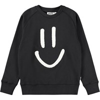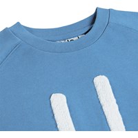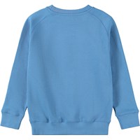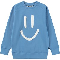 Blaues Sweatshirt aus weicher, biologischer Baumwolle mit Raglanärmeln und gerippten Kanten am Hals, an den Ärmeln und am Saum. Das Sweatshirt hat eine normale und entspannte Passform mit einer weißen und weichen lächelnden Stickerei auf der Vorderseite.