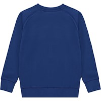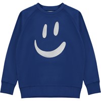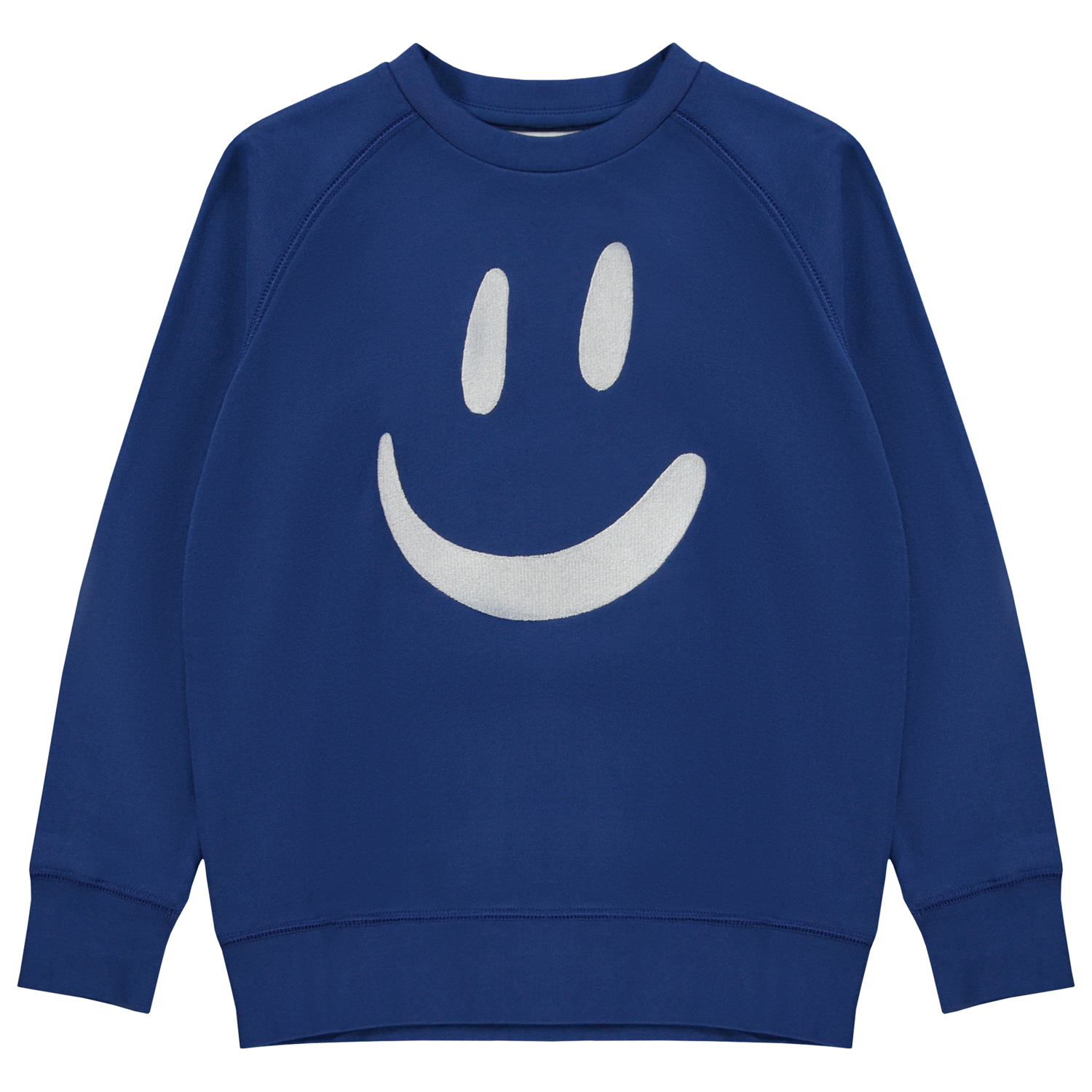 Blaues Sweatshirt mit Stickerei auf der Vorderseite. Die Stickerei ist ein großes lächelndes Gesicht in Weiß. Dieses Sweatshirt aus 100% Baumwolle hat Raglanärmel, einen Rundhalsausschnitt mit Rippbündchen, Rippbündchen an Hand und Hüfte und eine normale Passform.