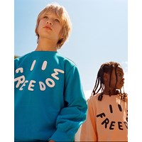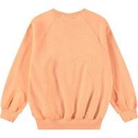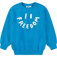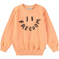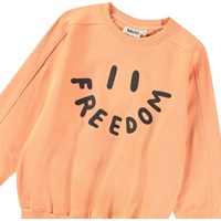 Oranges Sweatshirt aus weicher Öko-Baumwolle mit gerippten Kanten am Hals, an den Ärmeln und am unteren Saum des Sweatshirts. Das Sweatshirt hat Raglanärmel und eine lockere Passform mit einem Frontdruck eines lächelnden Gesichts, bei dem das Wort 'Freedom' den Mund bildet.