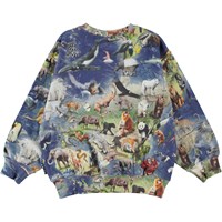Monti ist ein Unisex-Sweatshirt in Blau mit Aufdrucken der verschiedenen Tiere der Welt. Hat elastische Ripp an Hals, Ärmeln und Saum.