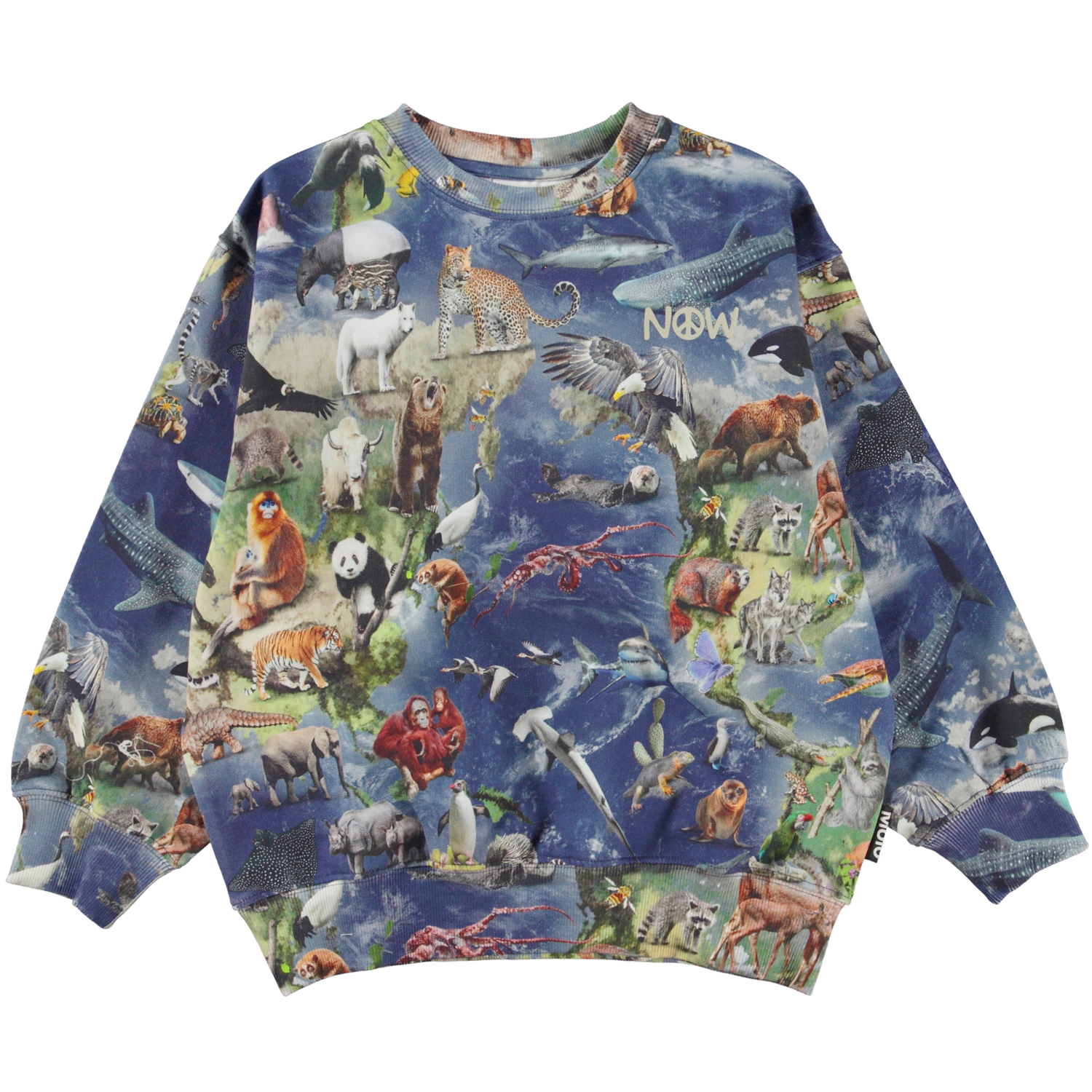 Monti ist ein Unisex-Sweatshirt in Blau mit Aufdrucken der verschiedenen Tiere der Welt. Hat elastische Ripp an Hals, Ärmeln und Saum.