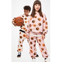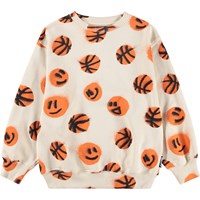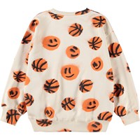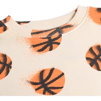Beiges Sweatshirt aus weicher, biologischer Baumwolle mit gerippten Kanten am Hals, an den Ärmeln und am Saum. Das Sweatshirt hat eine lockere und entspannte Passform mit einem Druck von orangefarbenen lächelnden Basketbällen.