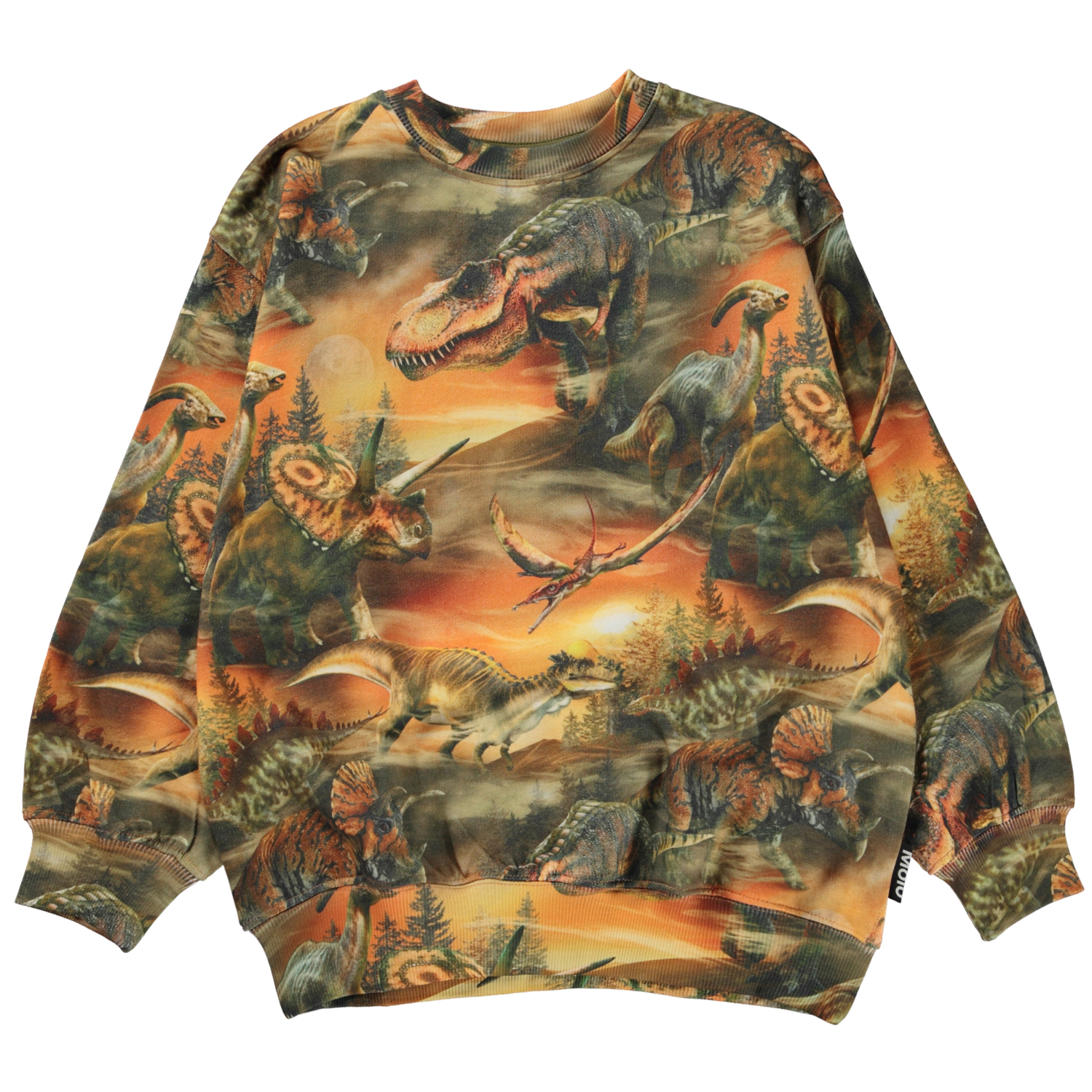 Grün-orangefarbenes Sweatshirt mit Allover-Print. Der Druck zeigt viele verschiedene Dinosaurier, die in der Abenddämmerung, kurz bevor die Nacht hereinbricht, durch die Sanddünen wandern. Über ihnen ist der Umriss des Mondes, der sie daran erinnert, dass sie Teil von etwas Größerem sind. Dieses Sweatshirt aus 100% Baumwolle hat einen Rundhalsausschnitt mit Rippbündchen, Rippbündchen an Hand und Hüfte und eine lockere Passform. Kombinieren Sie evt. dieses Sweatshirt mit der Hose Adan im gleichen Aufdruck für das perfekte Set.