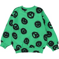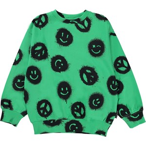 Monti ist ein Unisex-Sweatshirt in Grün mit einem Aufdruck aus Peace-Zeichen und Smileys. Hat elastische Ripp an Hals, Ärmeln und Saum.