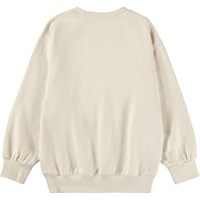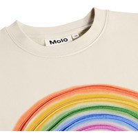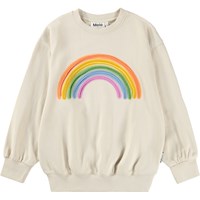 Beiges Sweatshirt aus weicher, biologischer Baumwolle mit gerippten Kanten am Hals, an den Ärmeln und am Saum. Das Sweatshirt hat eine lockere und entspannte Passform mit einem gestickten bunten Regenbogenmotiv auf der Vorderseite.