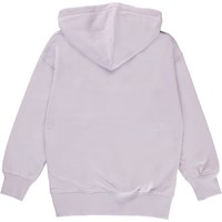 Moz ist ein helllila Unisex-Hoodie mit Taschen auf dem Bauch und einem schwarzen Logo-Patch auf der linken Seite. Moz hat Rippbündchen an Handgelenk und Hüfte.