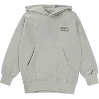 Moz ist ein grauer Unisex-Hoodie mit Taschen auf dem Bauch und einem schwarzen Logo-Patch auf der linken Seite. Moz hat Rippbündchen an Handgelenk und Hüfte.