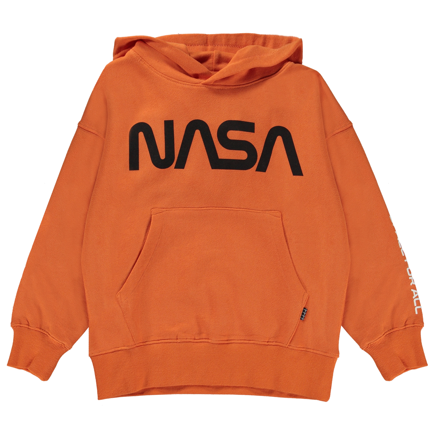 Orangefarbener Hoodie mit schwarzem Frontprint. „NASA“ ist auf der Vorderseite aufgedruckt, während die Botschaft „Space for All“ auf dem Ärmel aufgedruckt ist. Dieser Hoodie besteht aus 100% Baumwolle, hat eine Kängurutasche, Rippbündchen an Ärmel und Hüfte und eine lockere Passform. Kombinieren Sie evt. dieses Sweatshirt mit der Hose Adan in der gleichen Farbe für das perfekte Set.