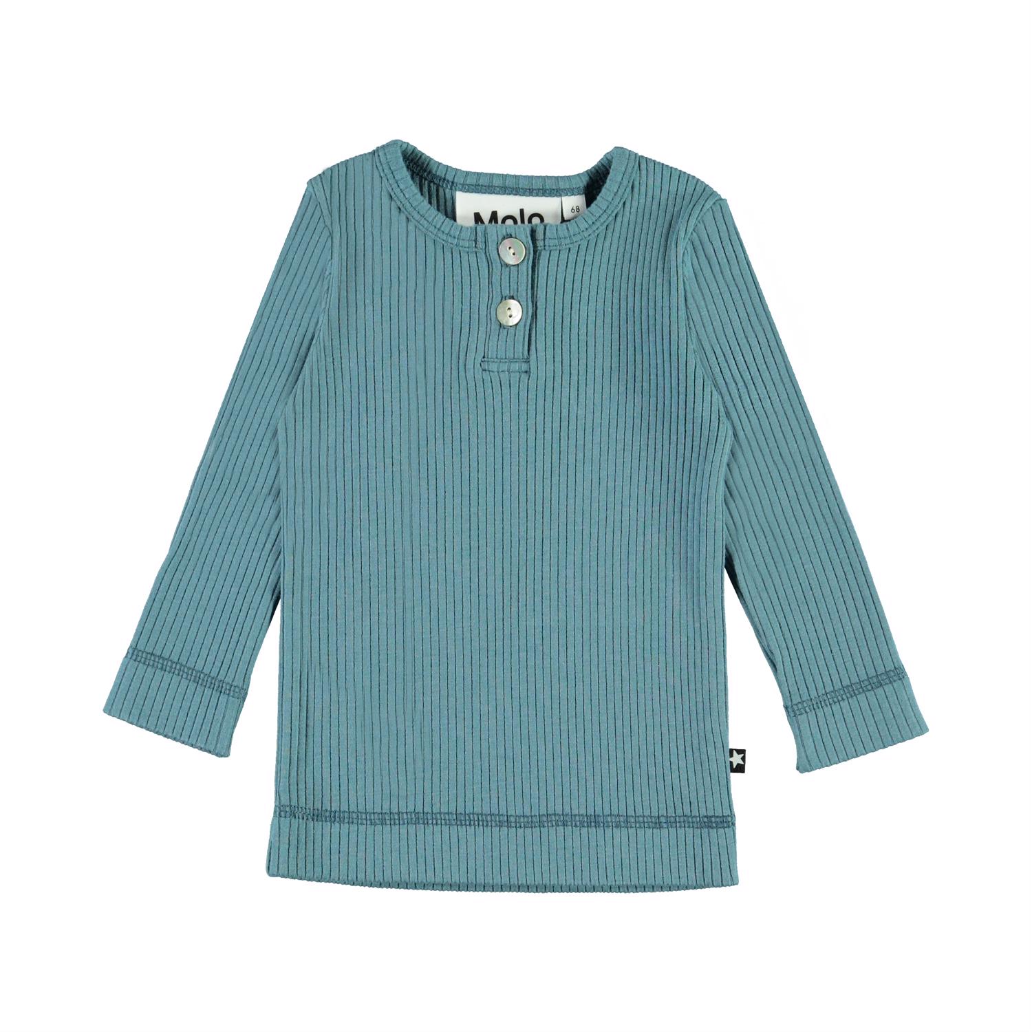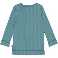 Earth ist ein blauer Babypullover in Rippqualität mit Knopfverschluss und hellgelber Kante am Hals. Kombiniere den Pullover mit einer passenden Hose.