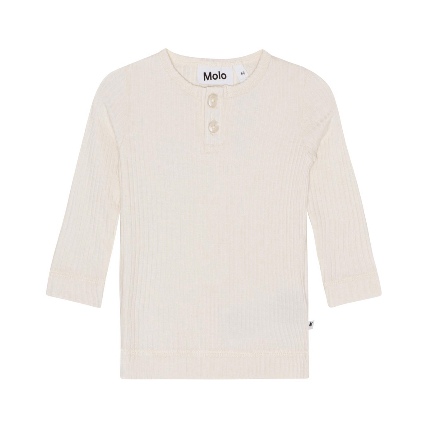 Cremefarbenes Langarmshirt für die Kleinen aus geripptem Viskosejersey. Das Shirt ist körpernah geschnitten und verfügt über zwei Knöpfe am Hals, die ein einfaches Anziehen und einen angenehmen Tragekomfort ermöglichen. Kombinieren Sie es mit einer Babyhose aus dem gleichen weichen Material und der gleichen Farbe und erhalten Sie ein komplettes Jersey-Set.