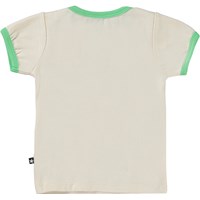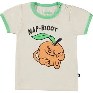 Easy ist ein Baby-T-Shirt in gebrochenem Weiß mit dem Aufdruck einer Aprikose, die ein Nickerchen macht. Easy hat einen doppelten Knopfverschluss an einer Schulter, was das An- und Ausziehen des Shirts erleichtert.