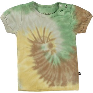 Easy ist ein Baby-T-Shirt mit Batik-Spiraldruck. Easy hat einen doppelten Knopfverschluss an einer Schulter, was das An- und Ausziehen des Shirts erleichtert.