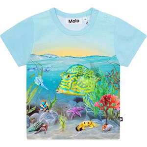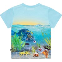 Hellblaues Baby-T-Shirt aus Öko-Baumwolljersey. Das T-Shirt hat eine körpernahe Passform, schmale Abschlüsse an Ärmeln und Halsausschnitt und zwei Druckknöpfe an der linken Schulter, die das Anziehen erleichtern. Auf dem Aufdruck des T-Shirts sieht man in die Unterseite Meer, wo es bunte Fische und Pflanzen gibt, sowie den letzten Sonnenuntergang. Der Druck folgt dem T-Shirt rundherum.