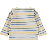 Langärmliges Shirt für die Kleinen, mit blauen, grünen und gelben Streifen aus Bio-Baumwolle. Es bietet gute Bewegungsfreiheit und hat Druckknöpfe an der Schulter, um das An- und Ausziehen zu erleichtern.
