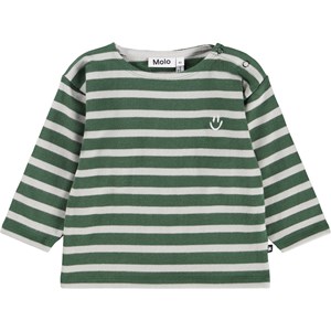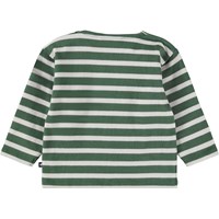 Bretonisches Langarmshirt für die Kleinen aus Öko-Baumwolle. Das Langarmshirt hat grüne Streifen und ein kleines weißes lächelndes Gesicht, das auf der Brust gestickt ist. Es hat eine lockere Passform und einen Rundhalsausschnitt mit Knopfverschluss auf der linken Schulter, um das An- und Ausziehen zu erleichtern.