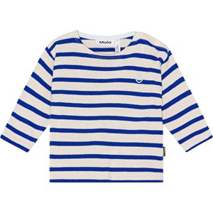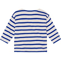 Gestreiftes Langarmshirt für die Kleinen aus weicher Öko-Baumwolle. Das Shirt hat eine lockere Passform, einen gerippten Rundhalsausschnitt und zwei Druckknöpfe an der linken Schulter, die das Anziehen erleichtern. Das Shirt hat blaue und sandfarbene Streifen und ein kleines gelbes Smiley-Gesicht auf der Brust.