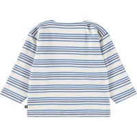 Langärmeliges Oberteil für die Kleinen aus Öko-Baumwolle. Das langärmelige Oberteil hat blaue Streifen und ein kleines blaues lächelndes Gesicht, das auf der Brust gestickt ist. Es hat eine lockere Passform und einen Rundhalsausschnitt mit Knopfverschluss auf der linken Schulter, um das An- und Ausziehen zu erleichtern.