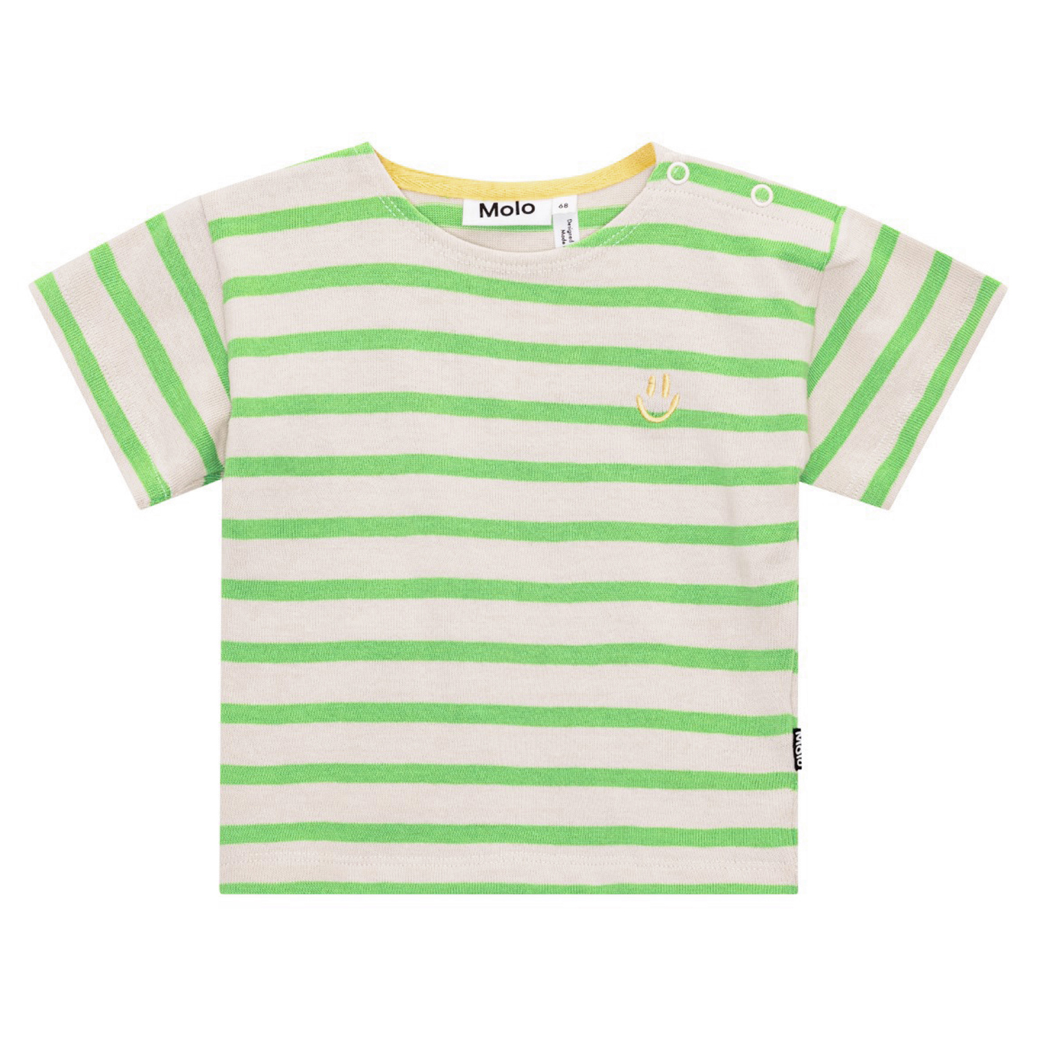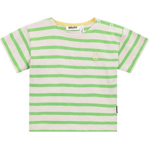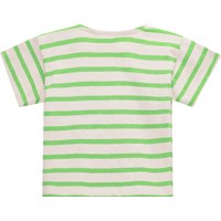 Gestreiftes T-Shirt für die Kleinen aus weicher Öko-Baumwolle. Das T-Shirt hat eine lockere Passform, einen Rundhalsausschnitt mit Rippstrickbündchen und zwei Druckknöpfe an der linken Schulter, die das Anziehen erleichtern. Das T-Shirt hat grüne und sandfarbene Streifen und ein kleines gelbes Smiley-Gesicht, das auf der Brust aufgestickt ist .