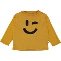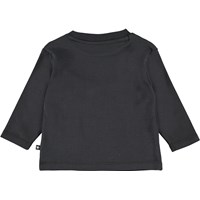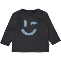 Eki ist ein schwarzer Babypullover mit einem Smiley-Aufdruck auf der Vorderseite. Der Pullover hat einen Knopfverschluss an einer Schulter.