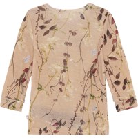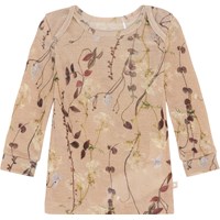 Eli ist eine rosafarbenes Babypullover mit Aufdrucken von Blumen und Blättern. Der Pullover ist aus 100% Merino Wolle und hat lange Ärmel.