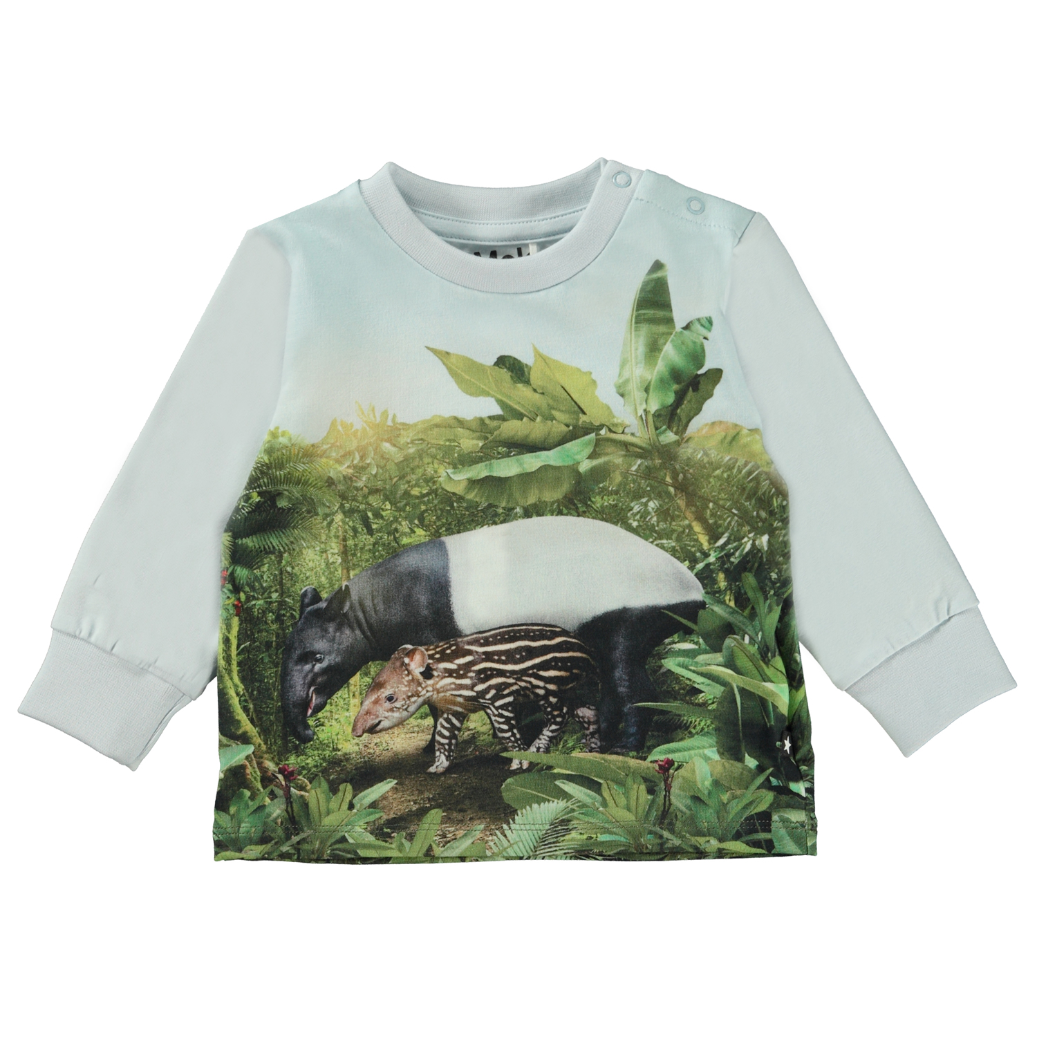 Eloy ist ein hellblaues Baby-T-Shirt mit einem Aufdruck von zwei Tapiren auf der Vorderseite und einem Faultier auf der Rückseite. Eloy hat einen doppelten Knopfverschluss an einer Schulter, was das An- und Ausziehen des Shirt erleichtert.